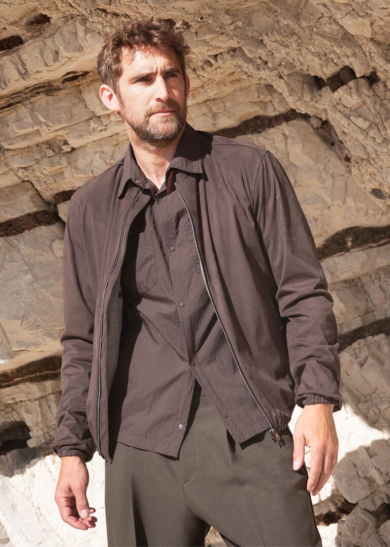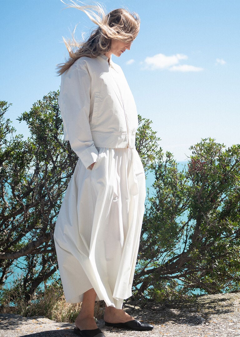 Light, clean-cut silhouettes adapt effortlessly to the wearer's body, combining protective volumes and flowing surfaces. Cool, tactile fabrics kissed by light reveal lived-in elegance shaped by movement and freedom.