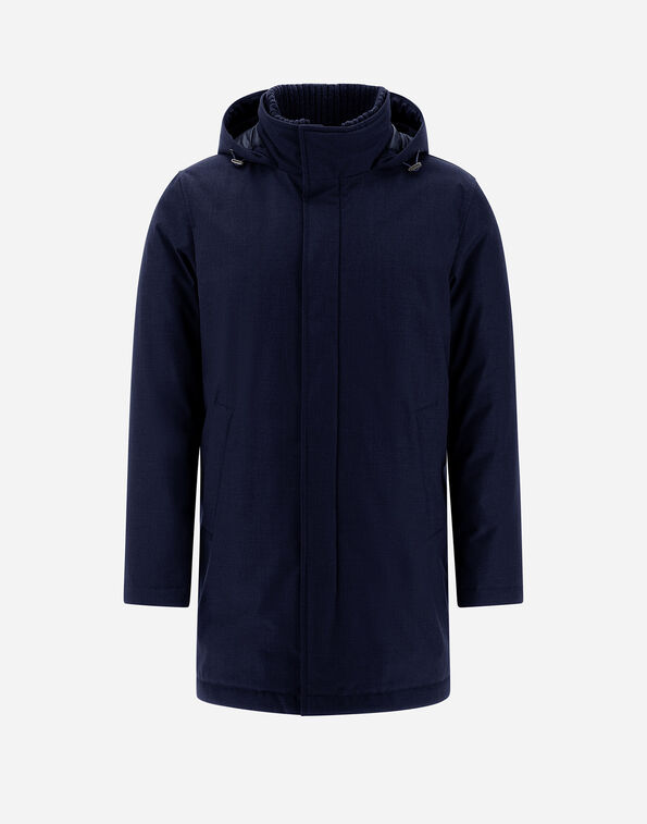 Jacket in technical fabric treated to recreate the fine look of worsted wool and finished with a super-light breathable and wind-resistant membrane.